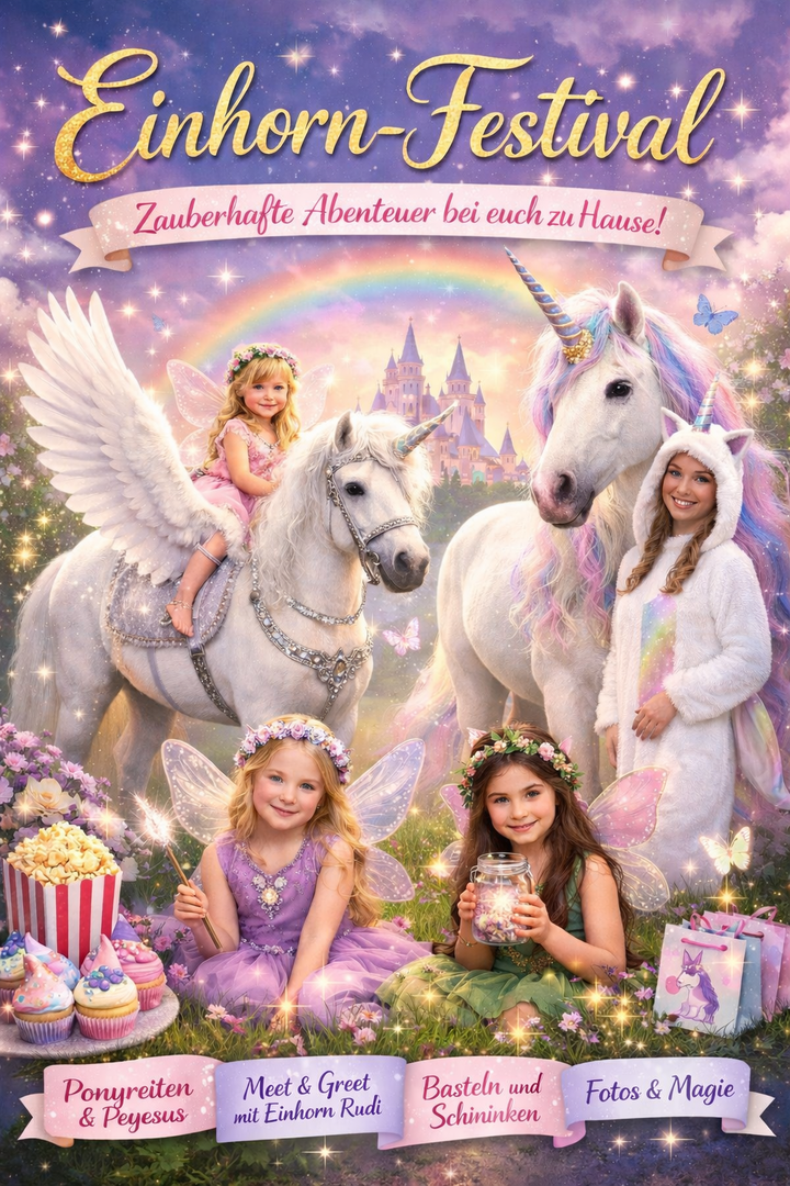 Das magische Einhorn-Festival kommt direkt nach Hause! Bei der Pony‑at‑Home Edition erleben Kinder auf dem eigenen Grundstück oder Firmengelände ein unvergessliches Einhorn-Abenteuer – ganz ohne Kutsche, dafür mit viel Nähe, Fantasie und Zauber.